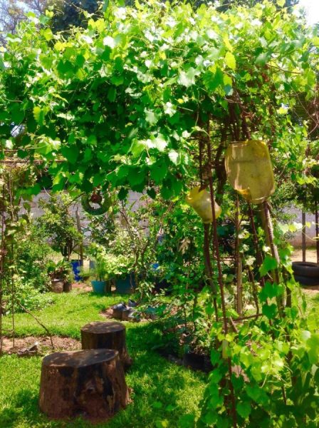The muscadine grape vines offer a refuge for humans and pets while providing a suitable environment for heat-sensitive potted plants. The shade mimics a tropical climate, which is comforting for these plants. The current crop will ripen in several weeks, promising a harvest period potentially lasting a month, especially when growing multiple varieties.